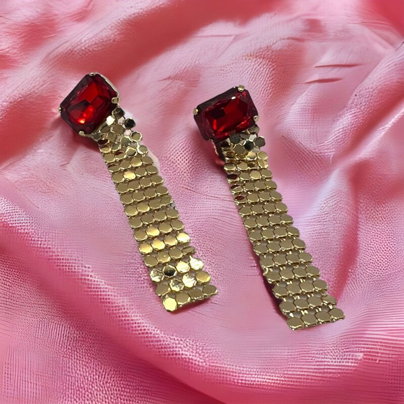 Orecchino pendente realizzato a mano, con strass e magliacalza in metallo